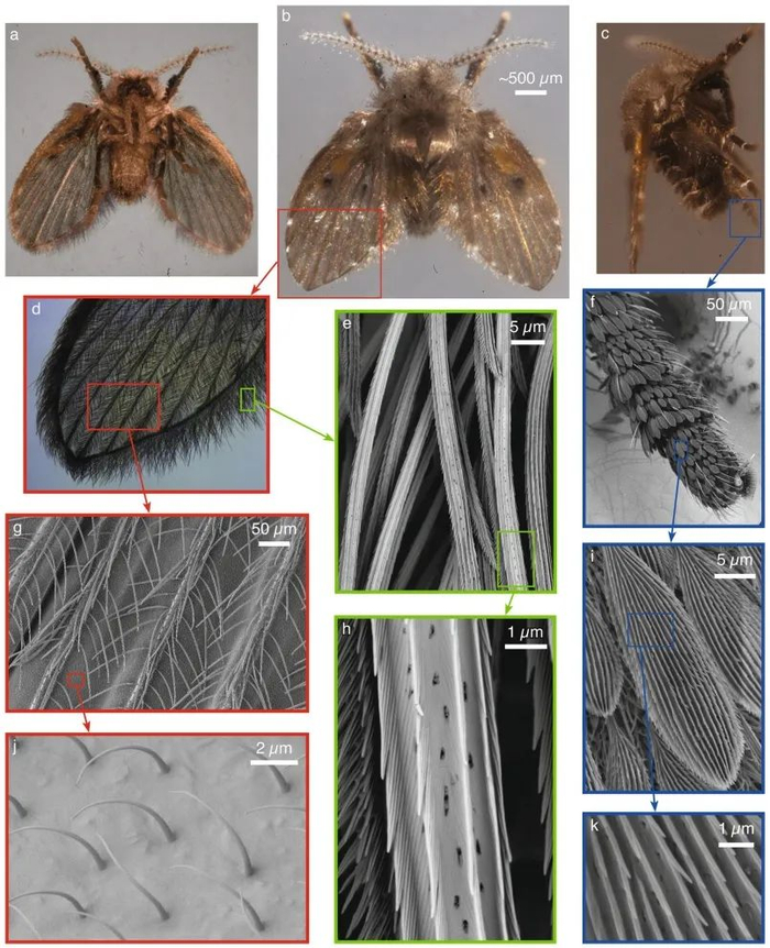 在下水道生存的另一大难题,是时不时就会出现的“滔天洪水”。蛾蠓身上有一套神奇的防水系统,秘密就藏在它那满身的绒毛里。蛾蠓体表覆盖的数千根细毛并非装饰,在超高放大倍率的电子显微镜下,这些细毛呈现出精密的构造。每根毛的表面有许多纳米级别的细小沟槽,共同形成了类似荷叶表面的超疏水层。