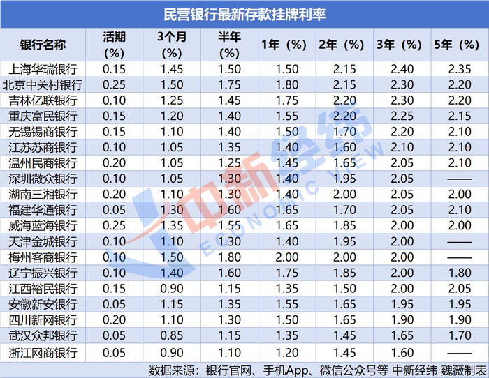 中新经纬梳理发现,目前民营银行的存款挂牌利率普遍高于国有六大行,多数民营银行3年期、5年期整存整取产品的挂牌年利率仍高于2%,如华瑞银行5年期整存整取产品挂牌年利率为2.35%,而工农中建四家大行同期限产品挂牌年利率为1.30%。