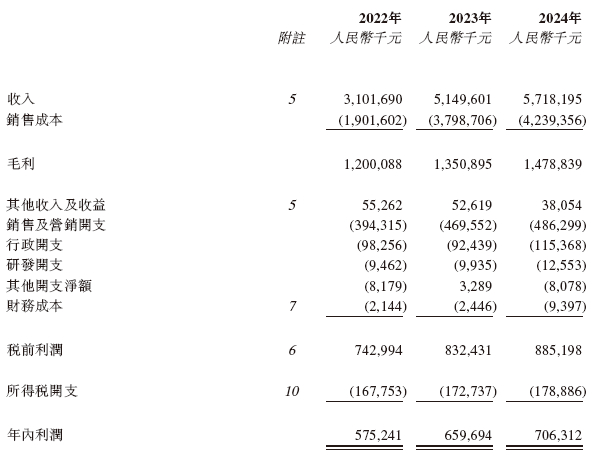 招股书显示,在过去的2022年、2023年和2024年,周六福的营业收入分别为人民币31.02亿、51.50亿和57.18亿元,相应的净利润分别为人民币5.75亿、6.60亿和7.06亿元。