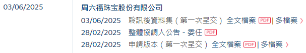 2025年6月3日,来自广东深圳的周六福珠宝股份有限公司 Zhou Liu Fu Jewellery Co., Ltd.(简称“周六福”)在港交所披露聆讯后的招股书,或很快在香港主板上市。其于2024年6月27日、2025年2月28日先后两次递表。