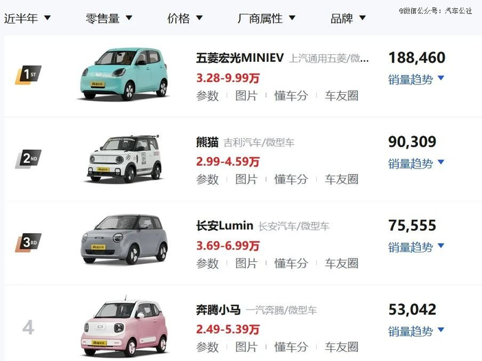 数据显示,最近半年的微型纯电车市场中,五菱宏光MINIEV、吉利熊猫、长安Lumin三款车型市场占有率超50%。奇瑞QQ冰淇淋、奔腾小马虽凭借品牌影响力占据一定份额,但市场表现远不及头部产品。