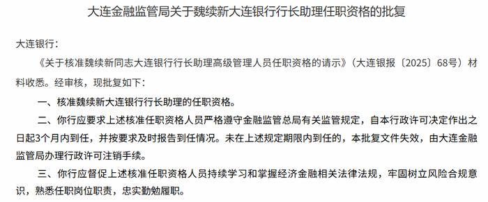 图片系大连金融监管局核准魏续新大连银行行长助理任职资格