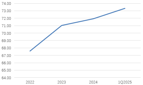 图片系近几年大连银行风险加权资产/总资产水平(%)