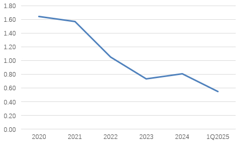 值得一提是的,近两年大连银行增加了债市投资,以图对冲息差下行的风险,但却远远不够。以今年一季度来看,尽管大连银行其他非息收入占比达到了创纪录的30.5%,但净息差却下降至0.55%。这一水平不仅难以覆盖相应管理和信用成本,而且在银行行业中,也是远低于同业的水平(根据国家金融监管总局数据,2025年一季度城商行平均净息差水平为1.37%)。