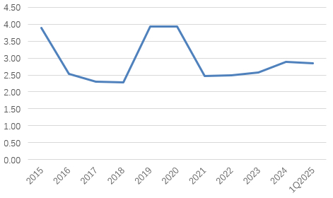 2024年,大连银行不良率较上年大幅上升31BP至2.88%,也是自2021年开始的上行周期中进一步上升。尽管今年一季度末有所回落至2.85%,但仍处绝对高位,高于同期城商行同业超1.0pct。而自东方资产纾困以来,大连银行资产质量曾有短暂的改善,例如从2015年的3.89%大幅回落至2016年的2.53%;从2020年的3.94%大幅回落至2021年的2.46%。现如今,不良率又现向上趋势,近况值得警惕。