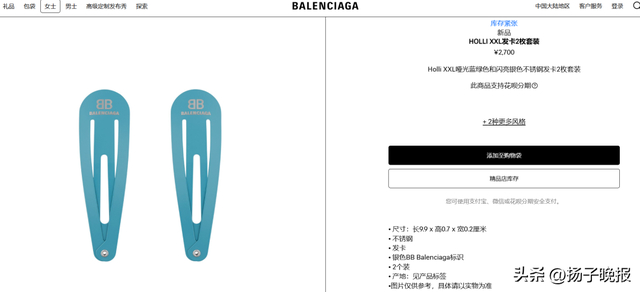 官网介绍称,该款发卡尺寸长9.9cm、高0.7cm、宽0.2cm,材质为不锈钢,上面印有“BB Balenciaga标识”。