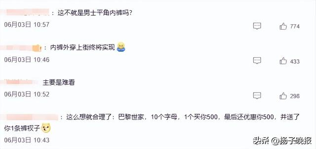 该设计也引发网友吐槽——有网友评论称:“这不就是男士平角内裤吗?”“真不是为了偷懒吗?”“这玩意儿居然还要4500一条?”甚至有网友称“感觉有点恶俗”……