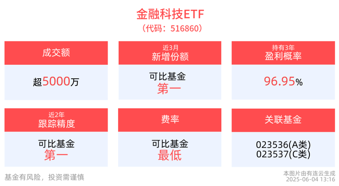跟踪精度方面,截至2025年6月3日,金融科技ETF近2年跟踪误差为0.046%,在可比基金中跟踪精度最高。