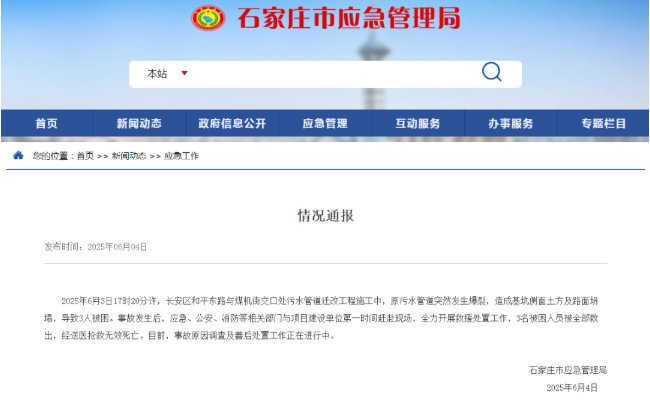 2025年6月3日17时20分许,长安区和平东路与煤机街交口处污水管道迁改工程施工中,原污水管道突然发生爆裂,造成基坑侧面土方及路面坍塌,导致3人被困。事故发生后,应急、公安、消防等相关部门与项目建设单位第一时间赶赴现场,全力开展救援处置工作,3名被困人员被全部救出,经送医抢救无效死亡。目前,事故原因调查及善后处置工作正在进行中。