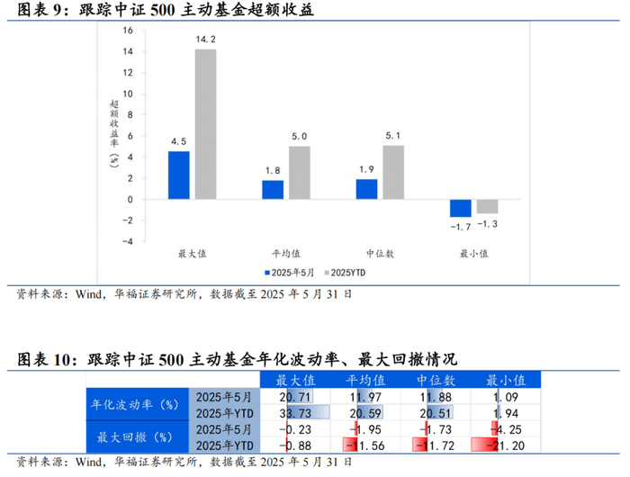 2025年5月,跟踪指数为中证500的主动量化基金相对中证500指数超额收益均值为1.8%,分布区间较2025年初至今超额收益表现更窄。2025年5月份基金波动率均值低于2025年初至今、最大回撤均值小于2025年初至今。