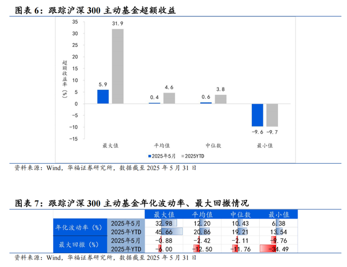 2025年5月,跟踪指数为沪深300的主动量化基金相对沪深300指数超额收益均值为0.4%,超额收益分布较2025年初至今更窄。2025年5月份净值波动率均值低于2025年初至今,最大回撤幅度均值小于2025年初至今。