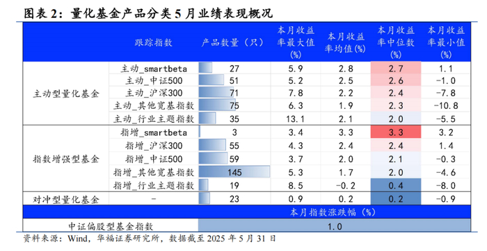 2025年5月,中证偏股基金指数收益率为1.0%,除跟踪行业主题的指增、对冲量化基金外,剩余类型量化基金5月收益率中位数均高于中证偏股基金指数收益表现。