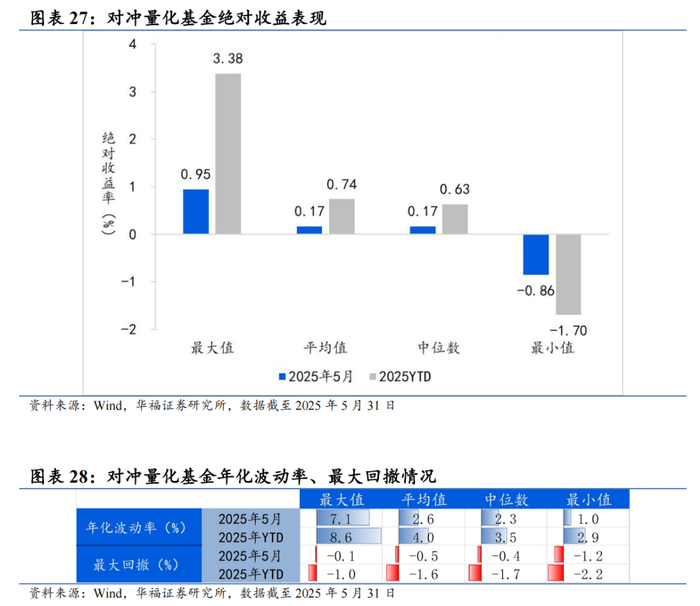 2025年5月,对冲量化基金收益绝对收益率平均收益0.17%。2025年5月份基金净值波动率低于2025年初至今、最大回撤均值低于2025年初至今。