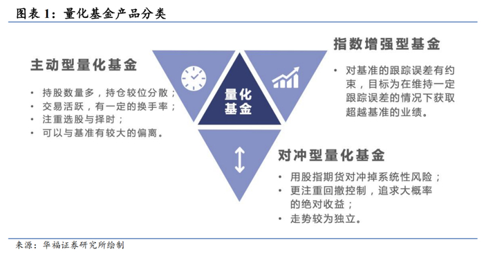 根据交易策略的不同,我国的量化基金产品大致可分为三类:主动量化基金、指数增强量化基金与对冲量化基金,三类产品有各自的特征与优势,适用于不同的交易需求。
