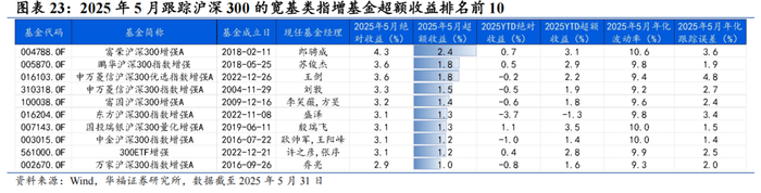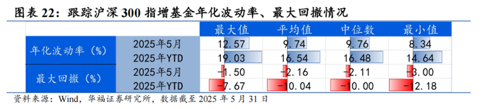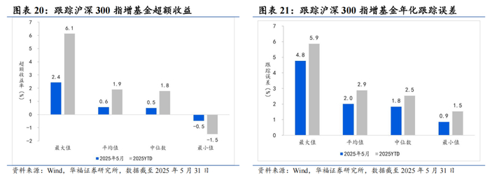 2025年5月,跟踪沪深300的指增基金相对沪深300指数的超额收益均值为0.6%。2025年5月份基金净值波动率均值低于2025年初至今;2025年5月跟踪误差均值为2.0%,低于2025年初至今水平。