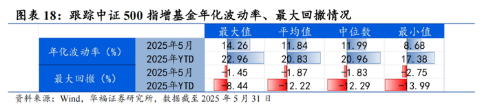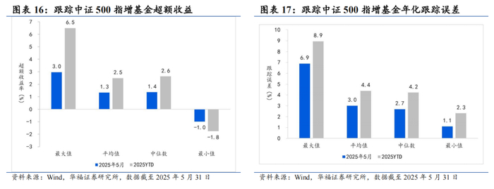 2025年5月,跟踪中证500的指增基金相对中证500指数的超额收益均值为1.3%。2025年5月份基金净值波动率均值低于2025年初至今;2025年5月跟踪误差均值为3.0%,低于2025年初至今水平。