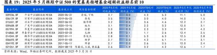 列举出2025年5月超额收益排名前10的跟踪中证500的指增基金,将收益表现概况及绩效指标展示如下表所示:
