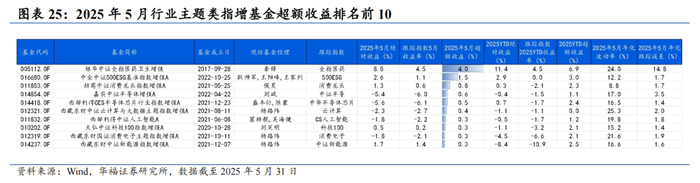列举出2025年5月超额收益排名前10的跟踪行业主题类指数的指增基金,其中跟踪全指医药、500ESG、消费龙头的指增基金本月份超额收益排名前三。将收益表现概况及绩效指标展示如下表所示: