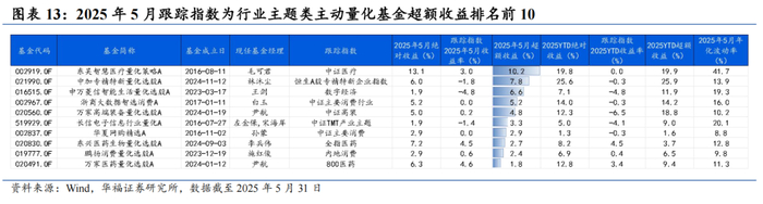 列举出2025年5月超额收益排名前10的跟踪指数为行业主题类指数的主动量化基金,其中跟踪中证医疗、恒生A股专精特新企业指数、数字经济指数的量化基金4月超额收益位列前3位。