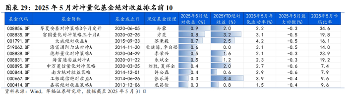 2025年5月,列举出本月度绝对收益排名前10的对冲量化基金,将收益表现概况及绩效指标展示如下表所示: