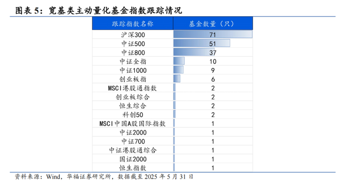 截至2025年5月31日,198只宽基类主动量化基金按跟踪指数分为跟踪16种指数,其中跟踪指数为沪深300指数、中证500指数、中证800指数基金数量分别为71、51、37只。