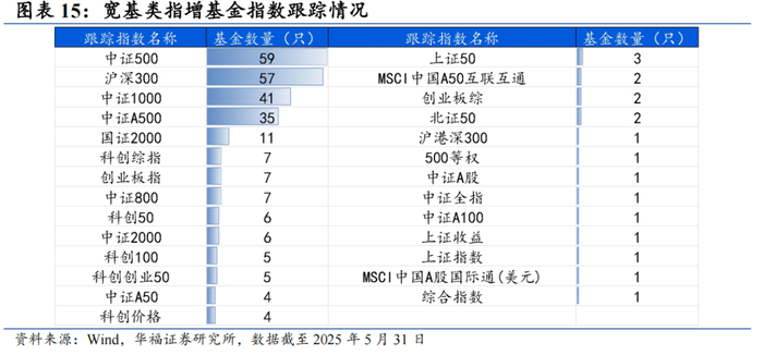 截至2025年5月31日,272只宽基类基金共跟踪27种指数,其中跟踪中证500、沪深300和中证1000指数基金数量分别为59、57和41只。
