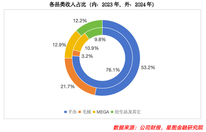 2024年,泡泡玛特将产品线重新分类,形成手办(核心收藏)、毛绒(大众把玩)、MEGA(高端藏品)、衍生品(日常渗透)的消费闭环,价格覆盖从几十元盲盒到数千元藏品。用户不仅购买玩具,更通过毛绒的独特设计、MEGA的限量属性彰显潮流身份;吊坠、吊牌及别针等衍生品则可挂在书包、行李与手机上,兼具文化与功能性,融入日常生活并强化社交属性。