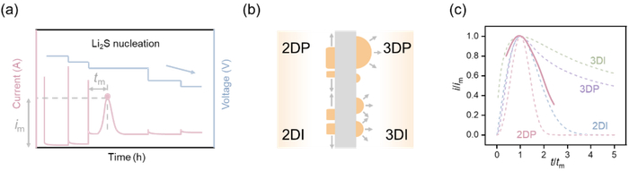 具体而言,PITT通过设置阶梯式电压扫描程序解析Li2S沉积过程。应采用微幅电压阶跃(如20 mV或更小)逐级扫描,以精准获取Li2S形核特征电位。测试过程中需保证每个恒压步骤的时间足够长,以避免前序反应未完全发生而影响后续反应过程,为此,可以设置预实验探索液固相变发生的电压大致范围以节省测试时间。当Li2S开始沉积时,由于三相界面(Li2S–电解液–导电骨架)先增大后减小,时间–电流曲线呈现特征峰形(图3a),能够读出出峰时间(tm)和形核电位。沉积容量可以通过对电流–时间曲线进行积分得到。tm越小,形核速率越快,表明Li2S形核动力学更具有优势。进一步地,通过无量纲化处理(t/tm–i/im),将沉积电流曲线与不同沉积模式的标准曲线进行对比,可判断出Li2S的沉积模式(图3b和3c)。通常认为Li2S进行三维沉积更加有利于实现更高的沉积容量。