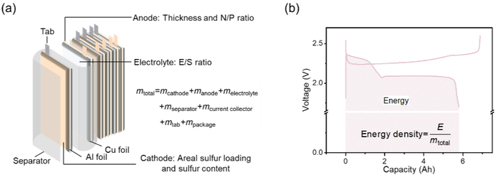 相比于纽扣电池,锂硫软包电池中非活性物质使用更少,展现出实现更高的能量密度的潜力。锂硫软包电池相比纽扣电池通常具有更高的硫载量、更低的电解液用量、以及更小的N/P比。锂硫软包电池的质量能量密度计算需要对电压‒容量曲线积分能够获得总放电能量,再除以全电池质量。特别需要注意的是,为了更真实的反应其实际能量密度,全电池质量计算需要考虑集流体、极耳、外包装等非活性物质,以免夸大实际所能实现的性能指标。