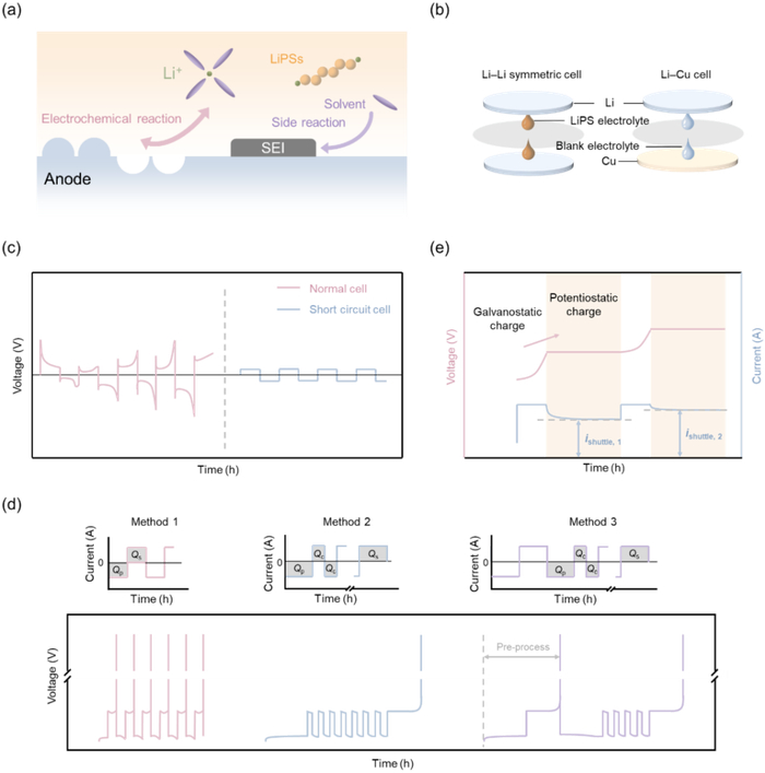 多硫化锂对锂负极的持续腐蚀会显著影响锂硫电池的循环稳定性。可以通过测量穿梭电流来定量评估多硫化锂对金属锂的腐蚀情况。测试时,将锂硫全电池放电至1.7 V,随后恒流充电至指定电压,在该电压下恒压充电直至获得稳定的电流,此电流即为穿梭电流。选择的恒压充电电压值应该控制在2.2–2.4 V,对应于大量多硫化锂存在电解液中的状态。越大的穿梭电流对应于越严重的多硫化锂腐蚀与更低的锂负极稳定性。