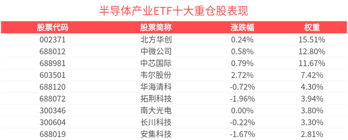 数据显示,截至2025年5月30日,中证半导体产业指数(931865)前十大权重股分别为北方华创(002371)、中微公司(688012)、中芯国际(688981)、海光信息(688041)、韦尔股份(603501)、南大光电(300346)、华海清科(688120)、拓荆科技(688072)、长川科技(300604)、安集科技(688019),前十大权重股合计占比75.47%。