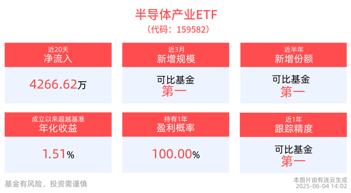 回撤方面,截至2025年6月3日,半导体产业ETF今年以来相对基准回撤0.48%。