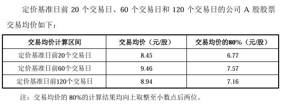 根据计算,定价基准日前20个交易日、60个交易日和120个交易日的交易均价80%,分别为6.77元/股、7.57元/股、7.16元/股。经交易各方协商后最终确定,将发行价格定为上述价格。