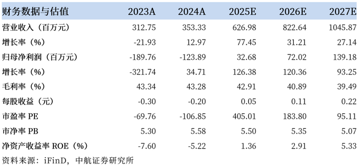 基于以上观点,我们预计公司2025-2027年的营业收入分别为6.27亿元、8.23亿元和10.46亿元,归母净利润分别为0.33亿元、0.72亿元及1.39亿元,EPS分别为0.05元、0.11元、0.22元。维持“买入”评级,当前股价分别对应2025-2027年405倍、184倍及95倍PE。