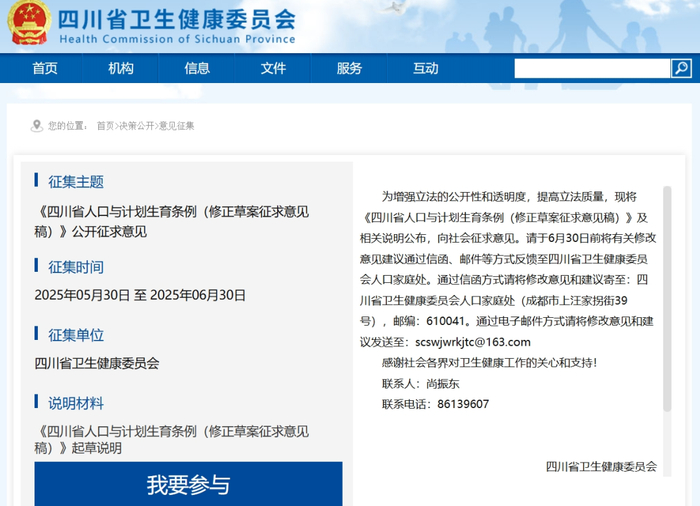 为增强立法的公开性和透明度,提高立法质量,现将《四川省人口与计划生育条例(修正草案征求意见稿)》及相关说明公布,向社会征求意见。请于6月30日前将有关修改意见建议通过信函、邮件等方式反馈至四川省卫生健康委员会人口家庭处。通过信函方式请将修改意见和建议寄至:四川省卫生健康委员会人口家庭处(成都市上汪家拐街39号),邮编:610041。通过电子邮件方式请将修改意见和建议发送至:scswjwrkjtc@163.com。