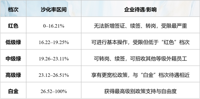 举例而言,某中资企业在沙特设立的公司共聘用23名员工,其中有9名为沙特籍员工,则其沙化率为39.13%,即达到白金等级。根据Nitaqat制度,该公司不仅具备申请额外外籍签证的资格,还可获得职业变更、居留许可续签及参与政府项目等多项便利。相比之下,红色档企业不仅无法办理新增外籍员工签证,还可能被禁止续签现有工作许可证,并对企业的正常运营带来严重影响。