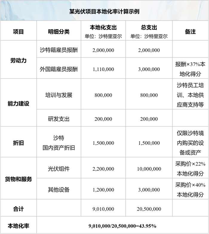 •货物和服务(采购):项目执行所需的任何货物和服务的沙特国内支出。此类支出不是产品价格的100%,而是应乘以其本地化分数,以真正反映其本地化的价值,例如,对于采购的光伏组件,本地化支出为其采购价格的22%。