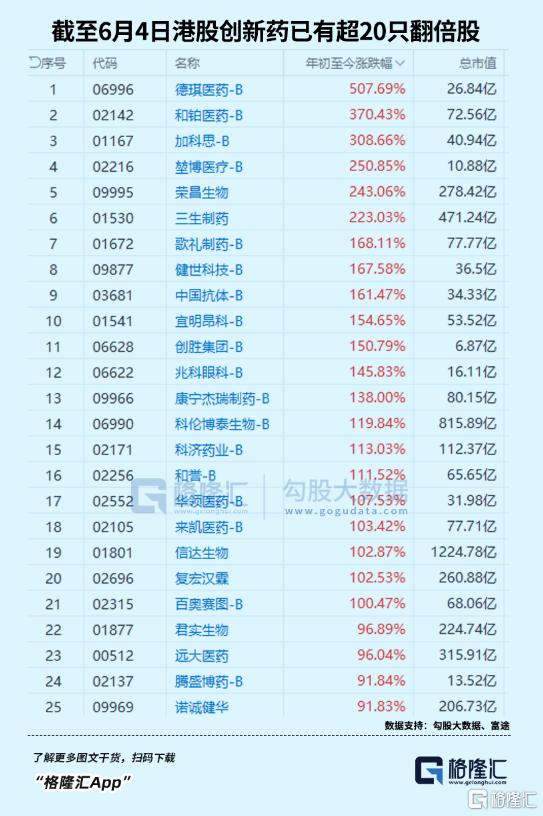 截至6月4日,创新药板块已成为了今年来A股和港股市场中股价翻倍最多的板块。单是港股就有21只创新药相关股票涨幅超过100%,其中已有6只涨幅超过2倍,另有近10只接近翻倍。
