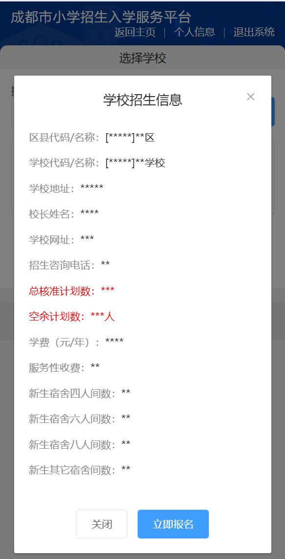 请仔细查阅民办小学的招生信息。若您需要填报该小学,可点击“立即报名”,接着点击“确定”;若您不打算选报该小学,点击“关闭”即可。