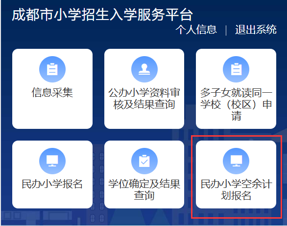 民办小学报名时间内,登录“成都市义务教育招生入学”平台后,请点击“民办小学报名”。