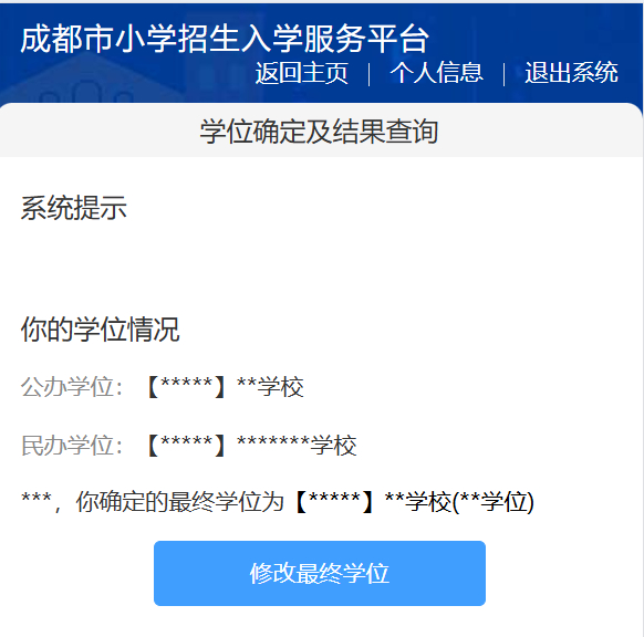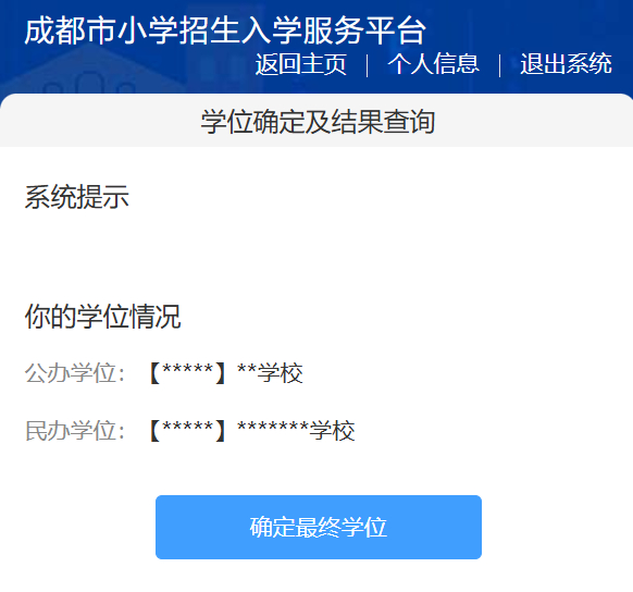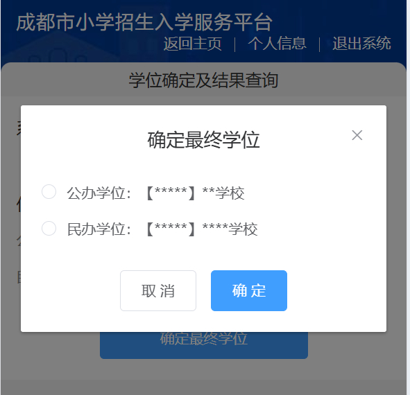 查询公办、民办小学学位信息,点击“确定最终学位”。