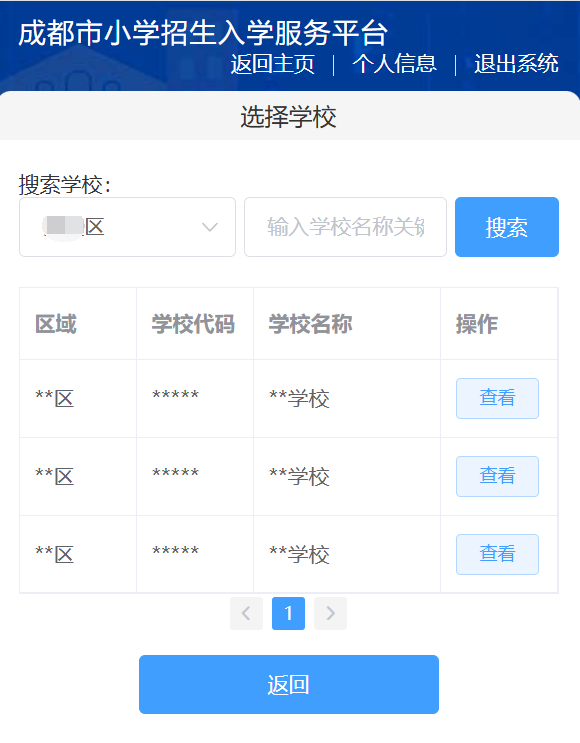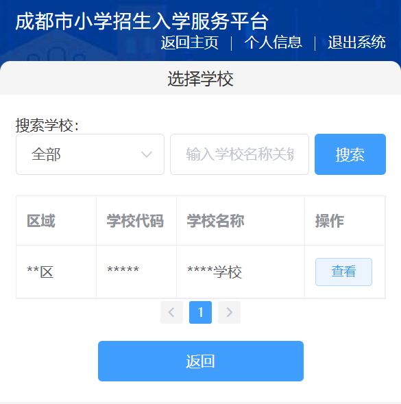 您可以依据民办小学所属的区(市)县以及学校名称来搜索民办小学。若您需要查看民办小学的详细信息,请点击该学校后面的“查看”按钮。