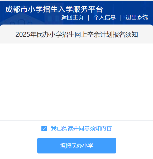 请认真阅读《2025 年民办小学招生网上空余计划报名须知》,阅读结束后,勾选“我已阅读并同意须知内容”,然后点击“填报民办小学”。