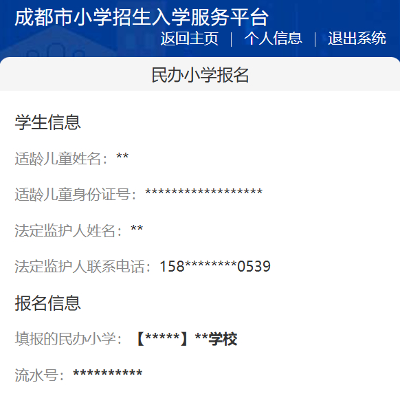 查询民办小学流水号时间为:6月10日10:00以后。适龄儿童监护人登录平台,点击“民办小学报名”-“查看报名信息”,查询流水号。