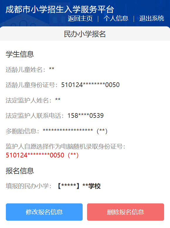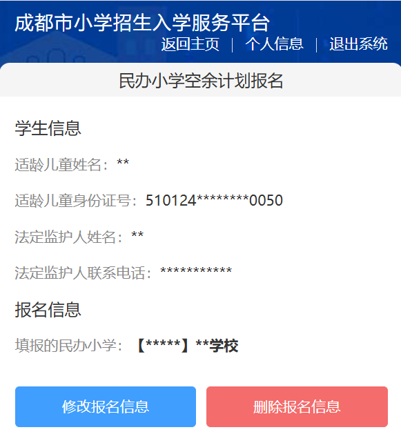 查看/修改/删除民办小学报名信息