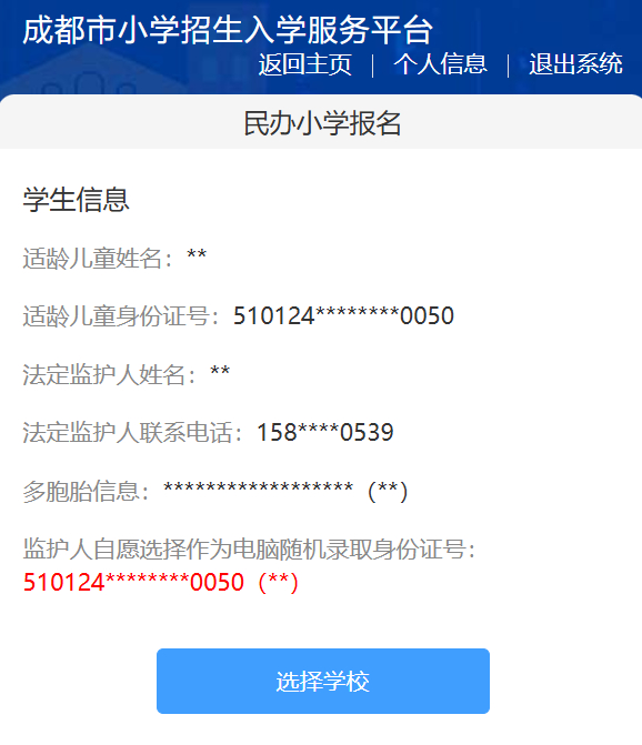 请认真核实适龄儿童信息以及监护人信息,若信息准确无误,请点击“选择学校”进入下一步。