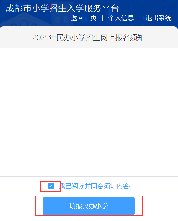 请认真阅读《2025 年民办小学招生网上报名须知》,阅读结束后,勾选“我已阅读并同意须知内容”,然后点击“填报民办小学”。