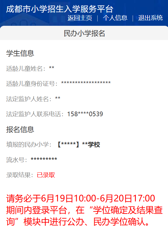 特别提醒:6月19日10:00-6月20日17:00已报名民办小学且被民办小学录取的学生家长请进行公办、民办学位最终确认,逾期未确认的,系统将默认家长放弃民办学位并以此公办学位作为该适龄儿童的最终学位。