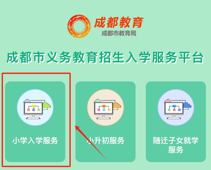 电脑网页访问:访问网址成都市义务教育招生入学服务平台(https://yjrx.cdeduypt.cn/),点击“小学入学服务”。
