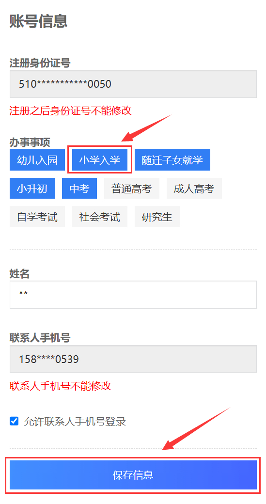 若没有,请在“我的事项”中点击“修改事项”,选中“小学入学”后点击“保存信息”,随后切换至“小学入学”办事事项。若已有,直接在“我的事项”中点击“小学入学”,切换到“小学入学”办事事项即可。